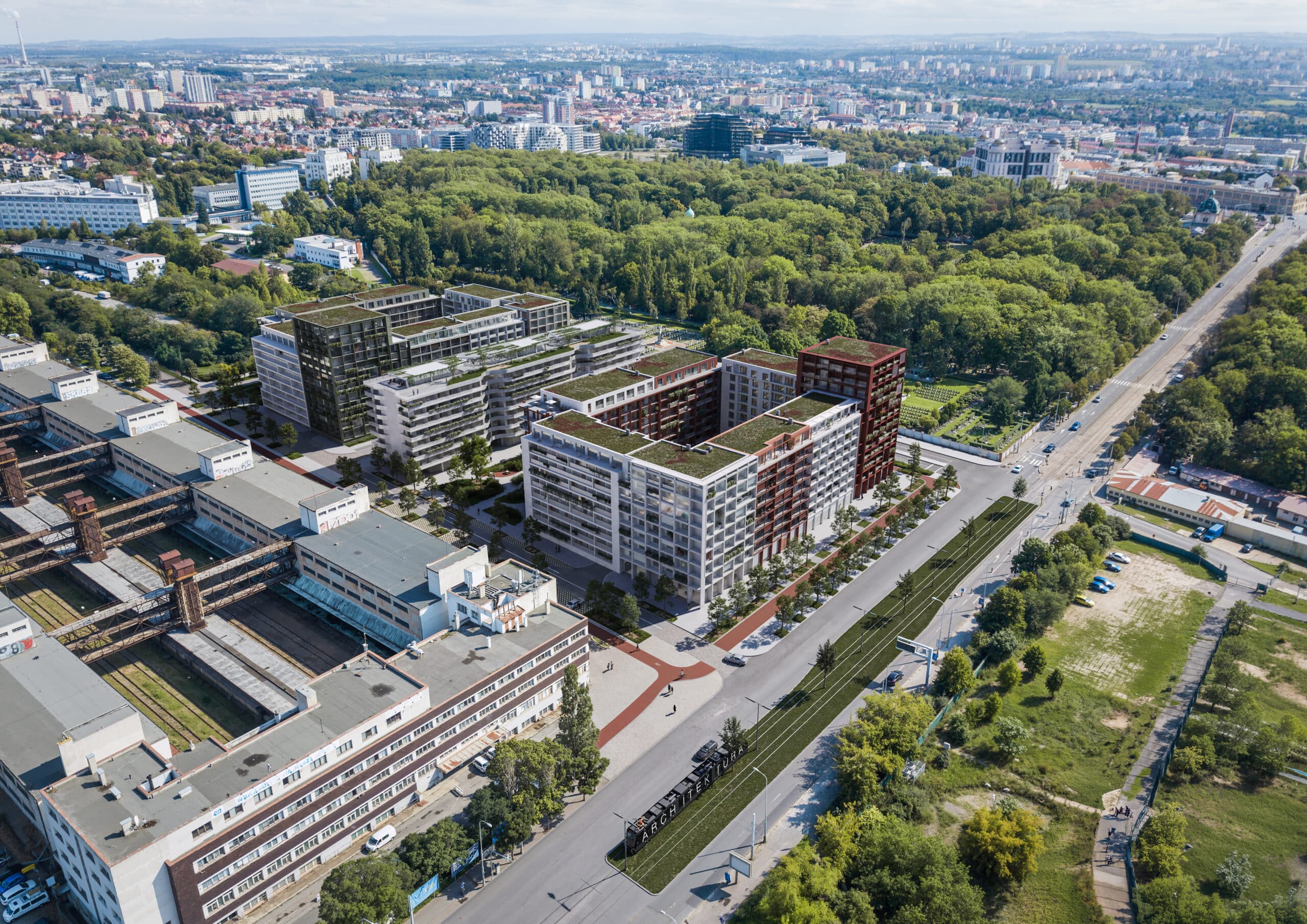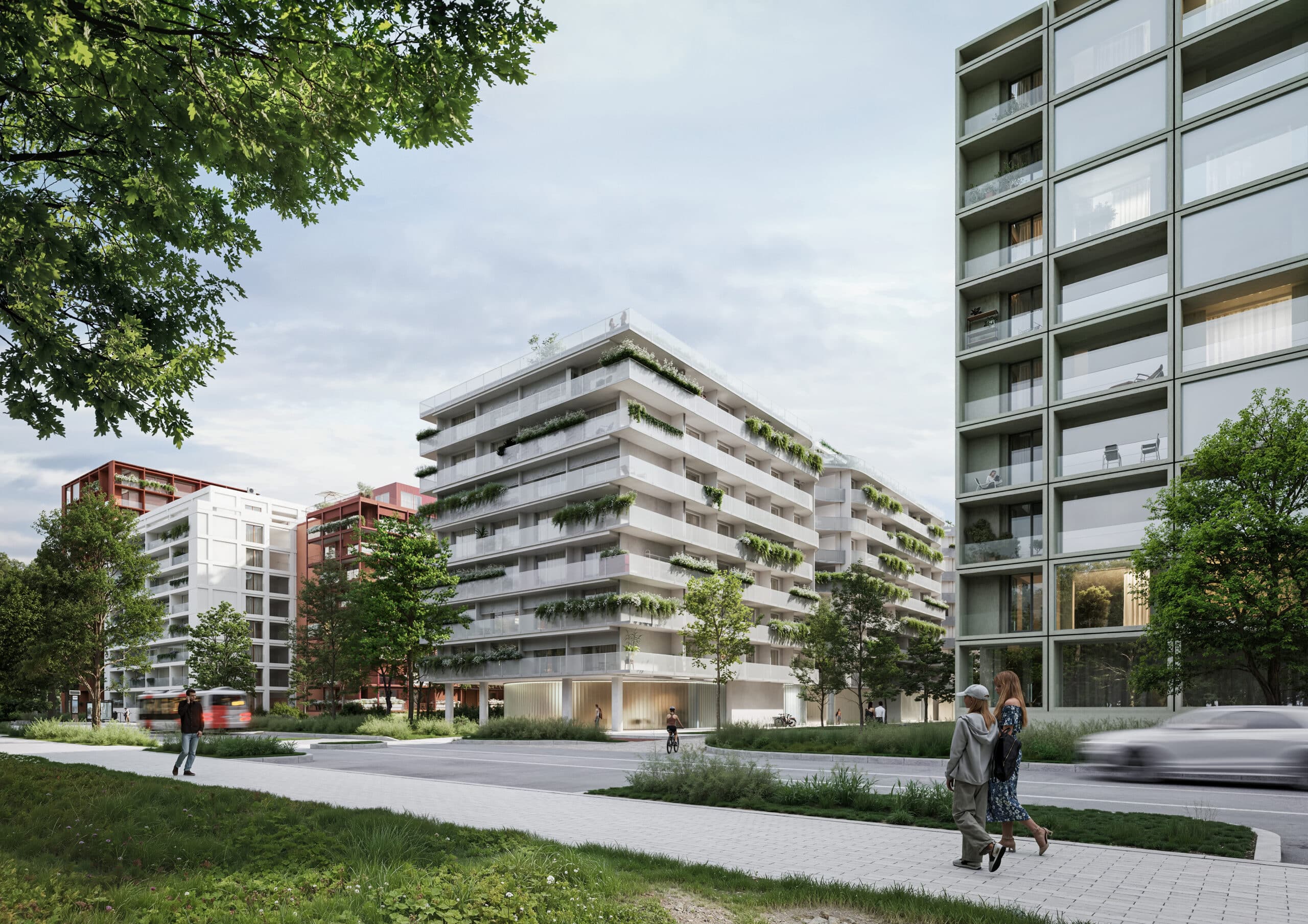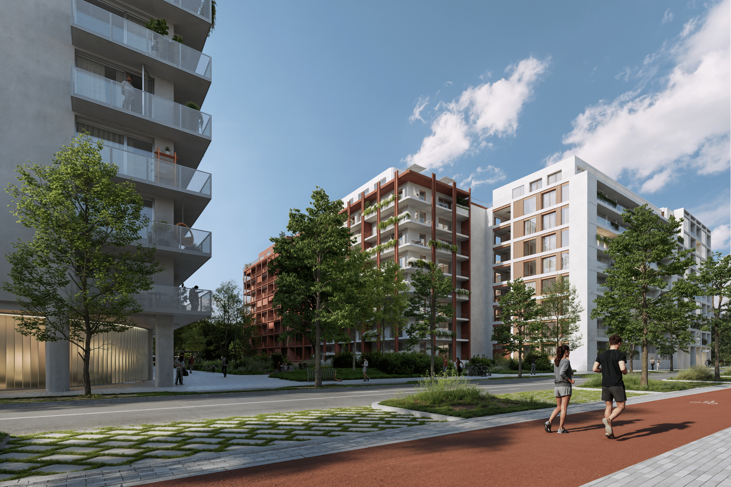 Rozčleněním hmot jsme zároveň zlepšili orientaci bytů i prostupnost území. Centrální habitat stojí na ose průchodu areálem a funguje jako orientační bod celého návrhu. Barevnost jednotlivých domů vychází z historického kontextu nákladového nádraží. Pracujeme s tóny cihlové, ocelářské zelené a neutrální šedé.